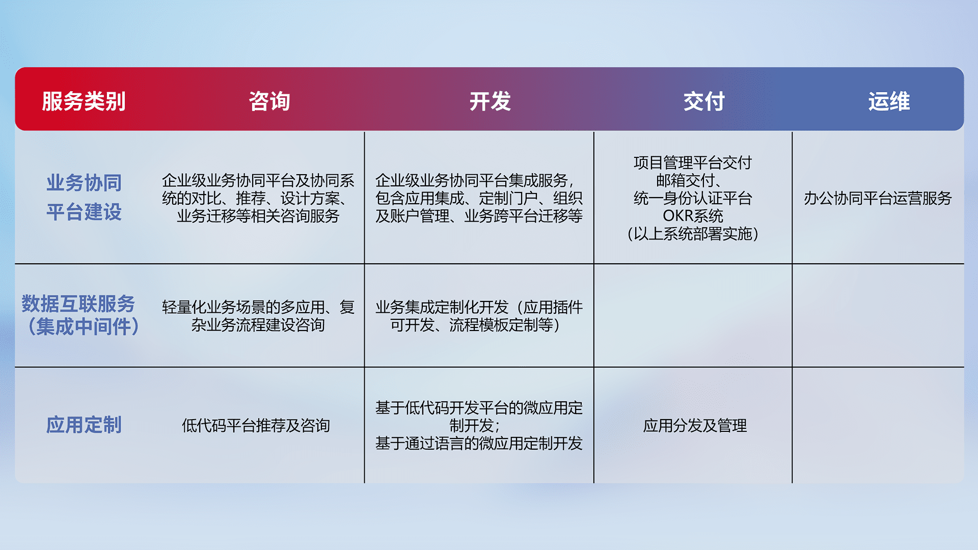针对钉钉、、、、企微、、、、IDaas等平台级产品提供产品的规划、、、方案、、、、交付、、、定制化开发等服务,,,实现如统一协同办公、、、智能客户服务、、混合会议管理、、智能数据查询、、、、等业务场景,,,,实现数字化转型。。。